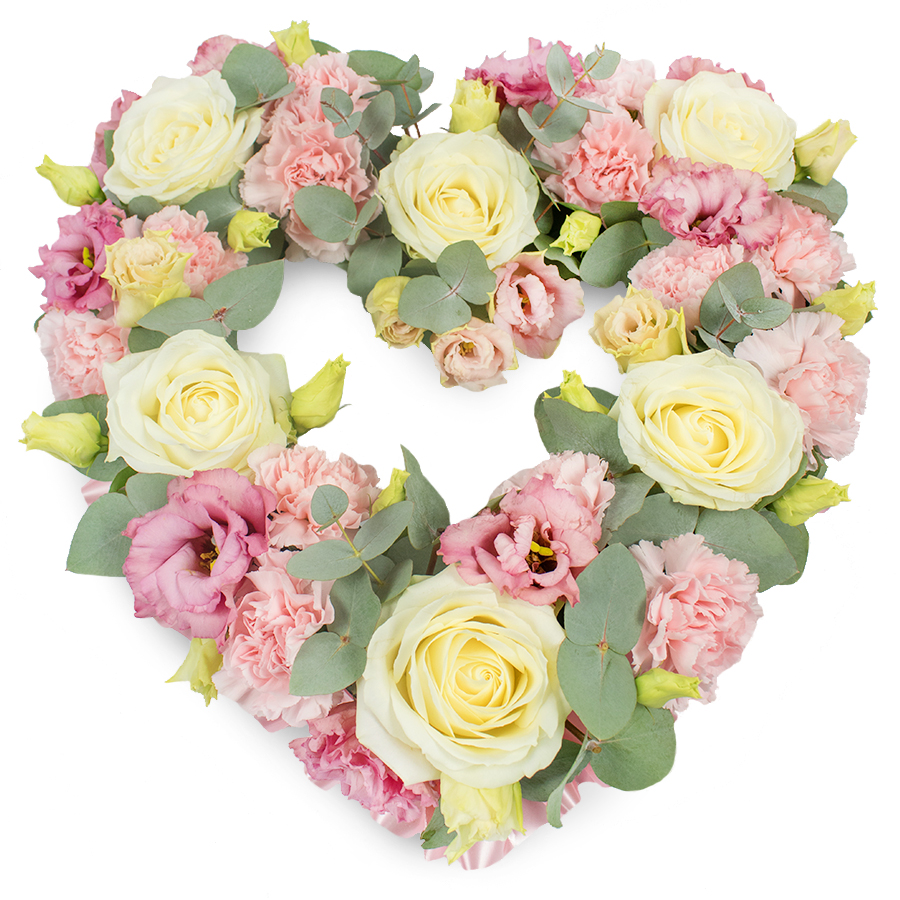 Celebrate cherished memories with our Elegant Open Heart Tribute Bouquet, a stunning arrangement that beautifully expresses your heartfelt sentiments. This unique bouquet features a harmonious blend of white roses, pink carnations, delicate pink lisianthus, and lush eucalyptus leaves, meticulously arranged to create a captivating display.